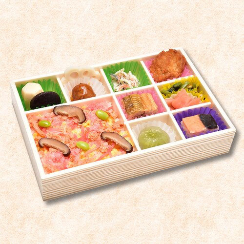 ちらし鮨(くずし玉子、紅鮭、紅生姜、枝豆、椎茸煮、桜でんぶ)、ます箱鮨、穴子箱鮨、六方里芋、椎茸煮、肉団子、鶏唐揚、野沢菜の煮物、根菜サラダ、花れんこん、つぼ漬、抹茶葛餅